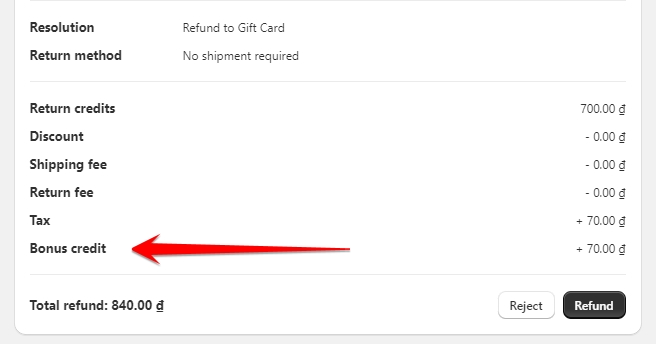 If you enable the refund to Gift Card and set up the amount, the customer will receive an additional fee based on the subtotal price.