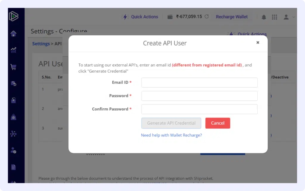On the pop-up menu, fill in the email (this should be different from the one used to register to ShipRocket).